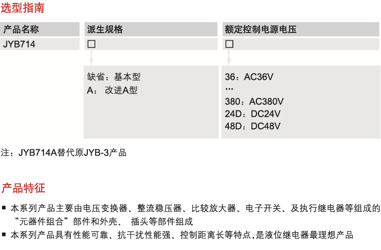 This series of products mainly consists of the "component combination" parts composed of voltage converters, rectifier regulators, comparison amplifiers, electronic switches, and actuator relays, the shells, and the plugs. With reliable performance, strong anti-interference performance and long control distance, this series of products is the most ideal product for liquid level relays.