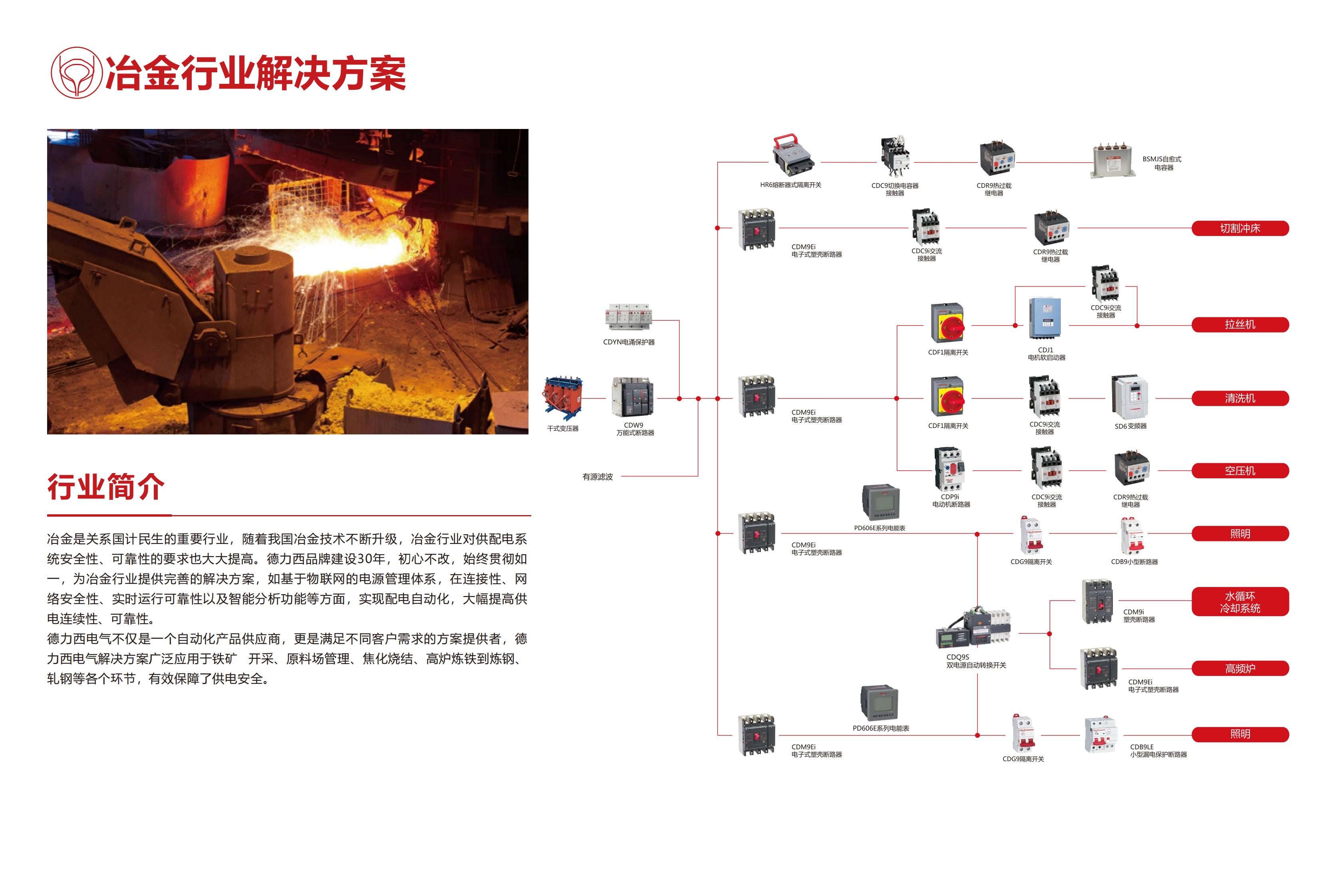 冶金是關(guān)系國計民生的重要行業(yè),隨著我國冶金技術(shù)不斷升級,對供配電系統(tǒng)的安全性、可靠性要求也大大提高,德力西品牌建設(shè)30年,初心不改,始終貫徹如已為冶金行業(yè)提供了完善的解決方案,如基于物聯(lián)網(wǎng)的電源管理體系結(jié)構(gòu)在連接性、網(wǎng)絡(luò)安全性、實時運(yùn)行可靠性以及智能分析功能等方面,實現(xiàn)配電自動化,大幅提高供電連續(xù)性、可靠性。德力西電氣不僅是一個自動化產(chǎn)品供應(yīng)商,更是滿足不同客戶需求的方案提供者,廣泛應(yīng)用于鐵礦開采、原料場管理、焦化燒結(jié)、高爐煉鐵到煉鋼、軋鋼等各個環(huán)節(jié),保障供電安全。